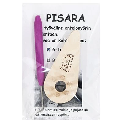 Alice A:n Pisara 6 on puinen työväline ontelonyörin neulontaan. Työväline on 6-tappinen. Voit käyttää halutessasi myös vain joka toista tappia, ja näin saat kolmikulmaisen nyörin. Pakkaus sisältää suomenkielisen ohjeen.