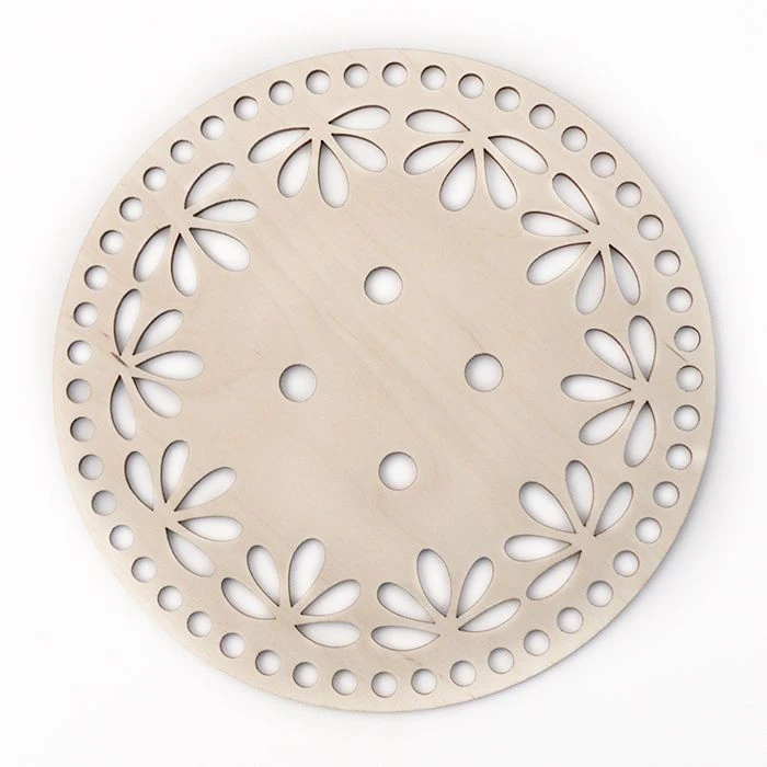 Käsittelemättömästä 3 mm puuvanerista laaserleikattu aihio virkkaus- ja makrameetöihin. Ulkoreunalla olevien reikien läpimitta 8mm.