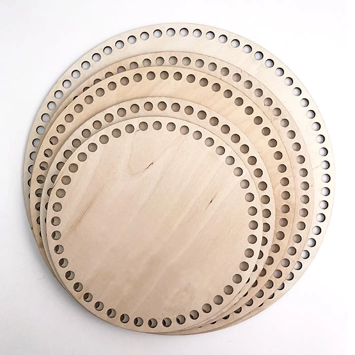 Käsittelemättömästä 3 mm puuvanerista laserleikattu korinpohja, reikien läpimitta 8mm. Viisi eri kokoa.